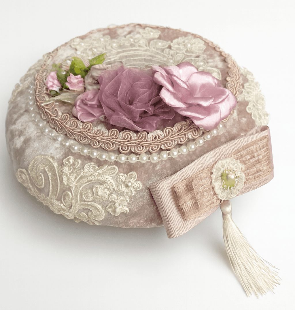 این جا جواهری دست‌دوز با پارچه مخملی در رنگ رز ملایم، تزئینات گیپور، مروارید و گل‌های پارچه‌ای، توسط برند خنچه سالار طراحی شده است. مناسب برای نگهداری زیورآلات، هدیه‌های خاص یا دکور سنتی لوکس. ترکیب رنگ‌های آرام، جزئیات دقیق و اصالت ایرانی، این محصول را به انتخابی بی‌نظیر تبدیل کرده است.